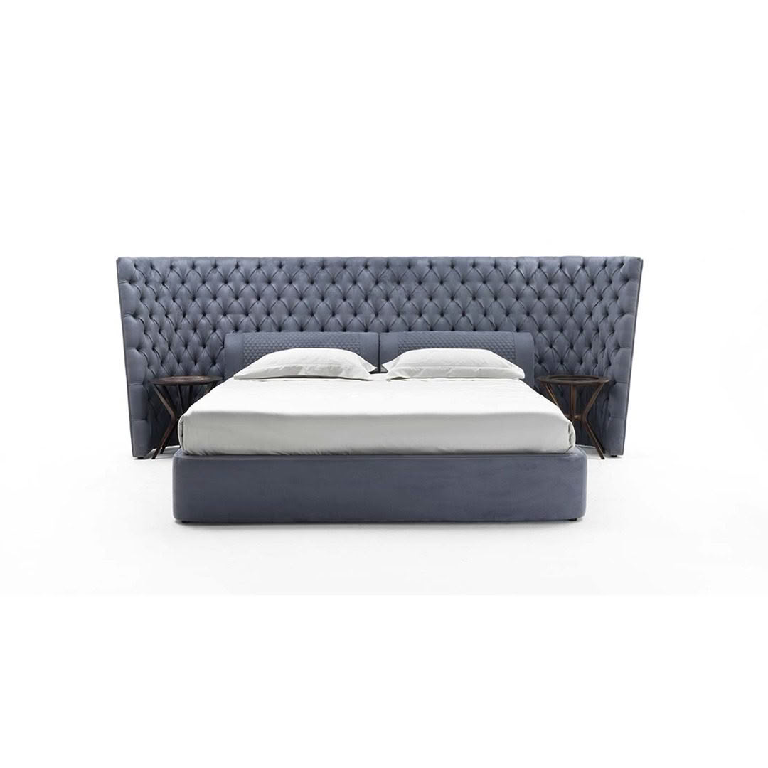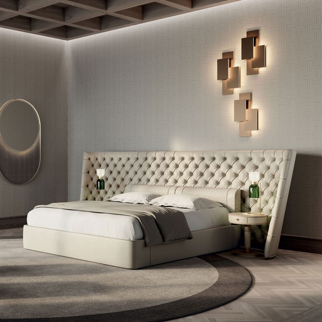 Phần tựa đầu giường rộng không chỉ tạo hiệu ứng thị giác sang trọng mà còn đủ khoảng trống để bố trí bàn đầu giường một cách cân đối. Toàn bộ bề mặt tựa được bọc capitonné tinh tế, tôn lên vẻ bề thế, trong khi khung giường gọn gàng giữ cho tổng thể vẫn thanh thoát và hiện đại.